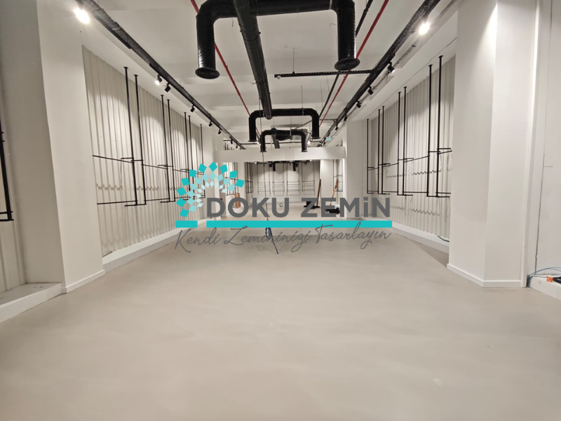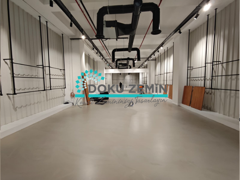 mikro beton, showroom zemin, dekoratif zemin kaplama, beton görünümlü zemin, derzsiz zemin, modern zemin, endüstriyel tasarım, zemin yenileme.